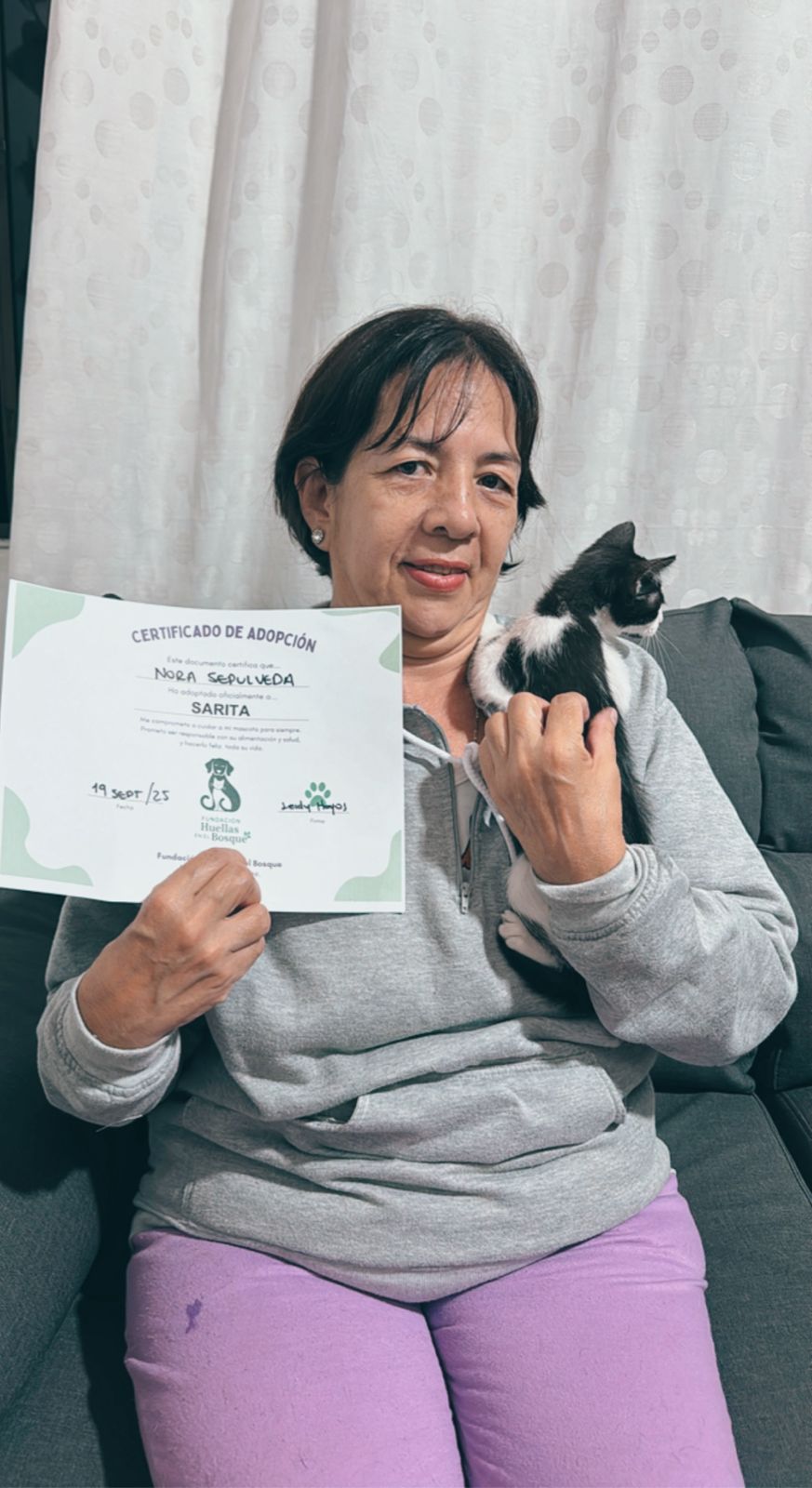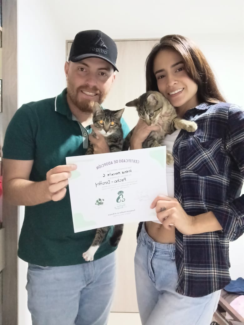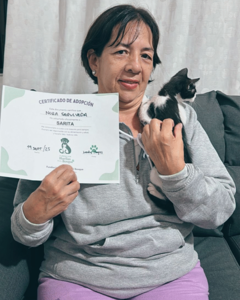 Mi nombre es Nora SepĂºlveda y adoptĂ© a mi gatita Sara gracias a la fundaciĂ³n. Desde su nacimiento, Leidy me enviaba fotos y videos, y cuando por fin la conocĂ fue un momento lleno de amor y emociĂ³n. Me preocupaba cĂ³mo se llevarĂa con mis otros gatos, pero con la ayuda de la fundaciĂ³n todo saliĂ³ perfecto: ahora todos conviven felices y mi gato Gabrielito la adoptĂ³ como su hermana. Agradezco profundamente la labor tan hermosa que realizan. ¡Dios los bendiga por cuidar y amar tanto a los animales!