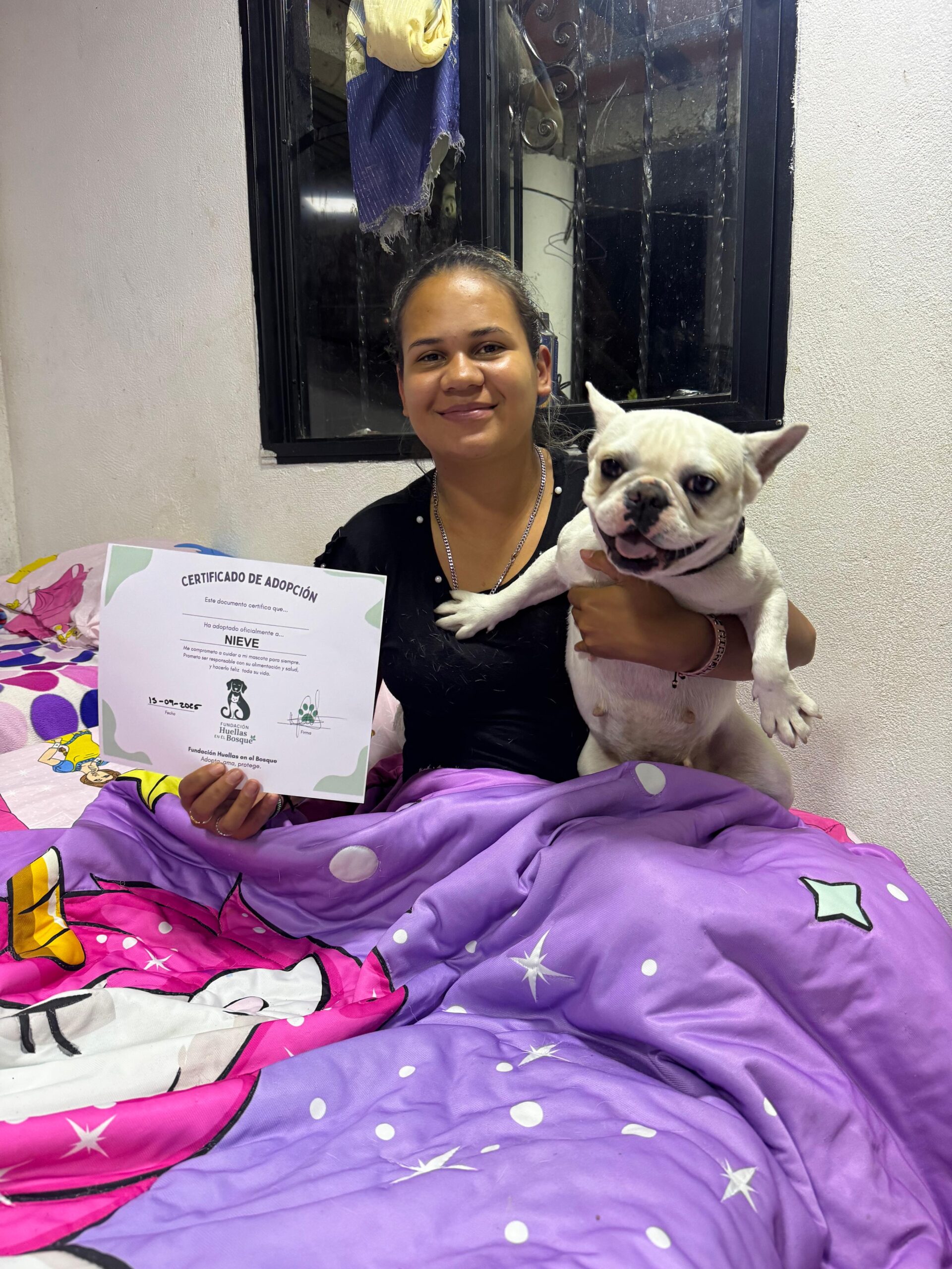Queremos expresar nuestro mĂ¡s profundo agradecimiento a la FundaciĂ³n Huellas del Bosque por permitirnos conocer y recibir a Sacha, una hermosa Bulldog francĂ©s que ha transformado nuestras vidas. Desde su llegada, Sacha nos ha regalado momentos de alegrĂa, ternura y compañĂa que jamĂ¡s imaginamos. Su energĂa, nobleza y cariño han llenado nuestro hogar de felicidad. Nos sentimos profundamente complacidos y bendecidos por haber tenido la oportunidad de compartir nuestra vida con ella. Gracias por confiar en nosotros y por el trabajo amoroso que realizan cada dĂa. Sacha no solo es parte de nuestra familia, es un testimonio vivo del impacto positivo que ustedes generan.